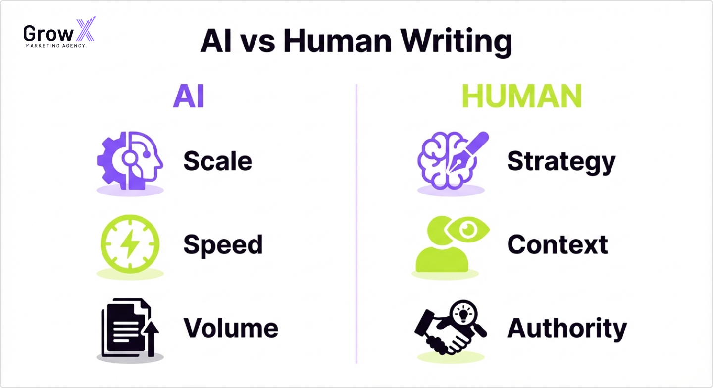 Human-generated content introduces originality, strategic framing and bold positioning. Human writers bring perspectives that cannot be scraped from datasets.Without that, messaging becomes interchangeable.