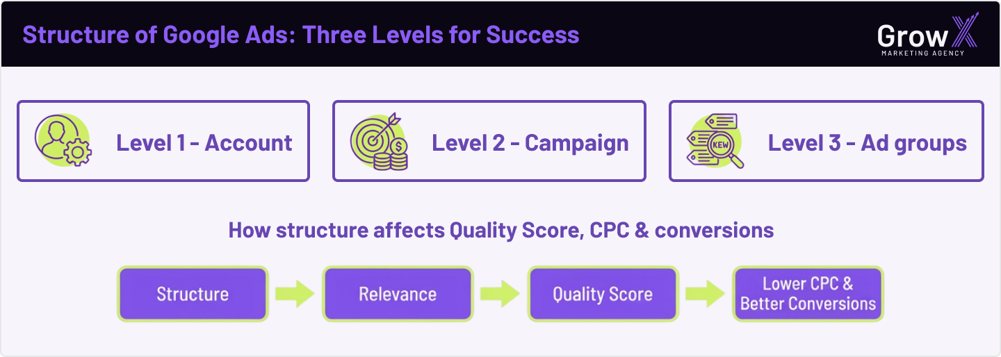 - a well-structured Google Ads account directly impacts Quality Score, CPC, conversions & algorithm learning;