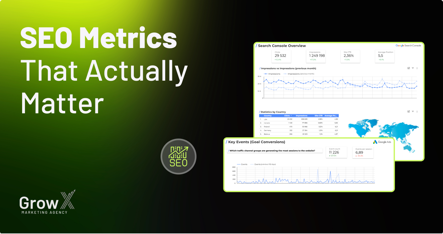 Grow X builds reporting systems that focus on SEO metrics that matter, not vanity charts. We create dashboards that combine visibility, traffic quality, engagement and conversion metrics in a single, easy-to-read view.
