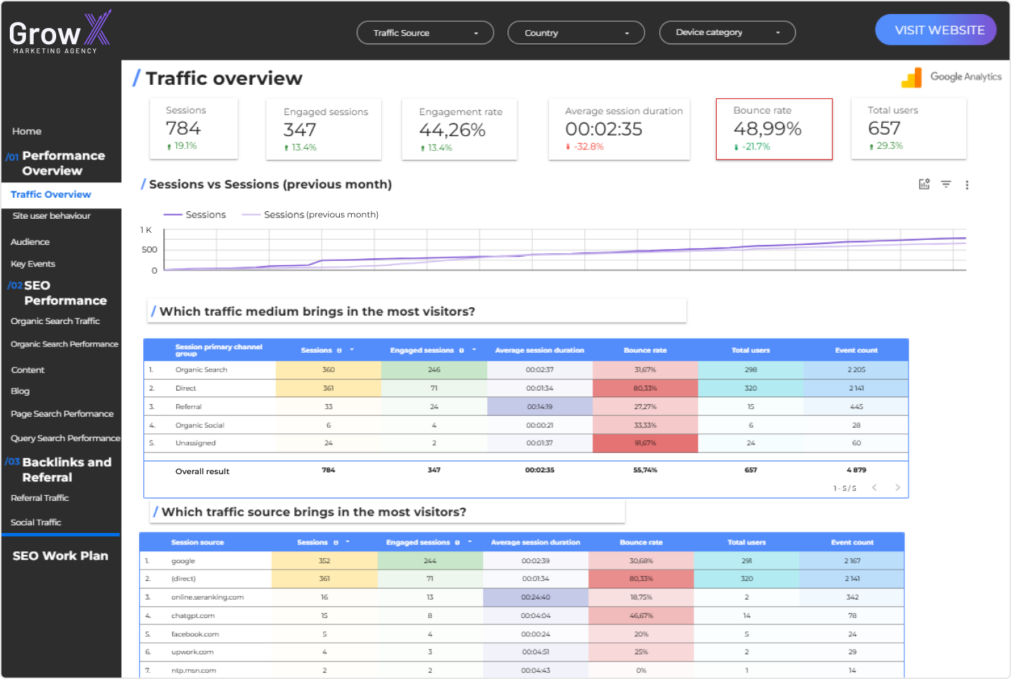 Sessions show volume. Users show audience growth. Comparing month-over-month trends in Google analytics reveals whether your visibility gains translate into real audience expansion.