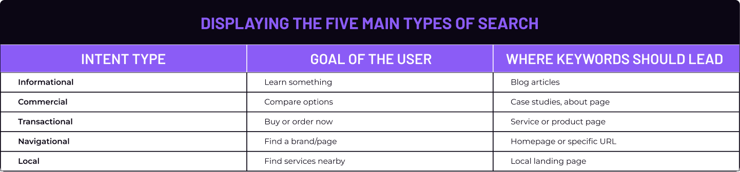 This is the reason behind the query. It explains why the user searches and what outcome they expect. It can be an informational, commercial, transactional, navigational or local goal.
